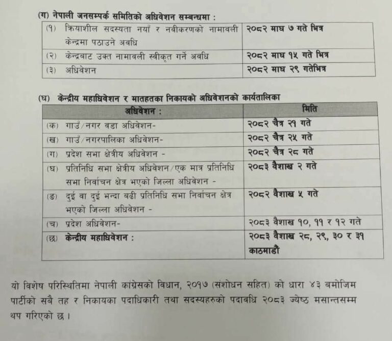 त्यस्तै नयाँ मिति अनुसार आगामी चैत २१ गते गाउँ–नगर वडा अधिवेशन, चैत २५ गते गाउँ–नगरपालिका अधिवेशनको मिति तोकिएको छ ।