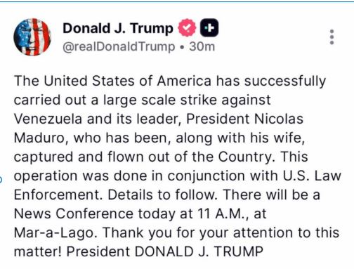 ट्रम्पले आफ्नो सामाजिक सञ्जाल प्लेटफर्म ‘ट्रुथ सोशल’ मा पोस्ट गर्दै अमेरिकोले भेनेजुएला विरुद्ध ठुलो सैन्य कारबाही गरेको र राष्ट्रपति मादुरोलाई उनकी पत्नीसहित पक्राउ गरी देशबाट बाहिर निकालिएको बताएका छन् ।