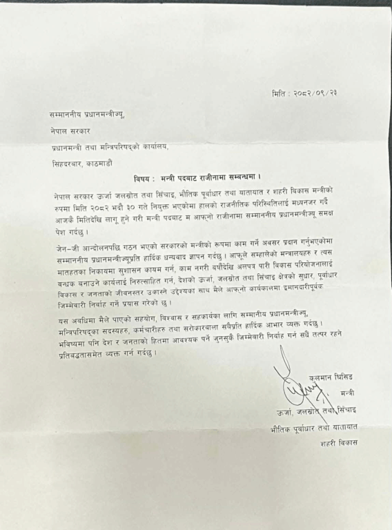 काठमाडौं । ऊर्जा, जलस्रोत तथा सिँचाइमन्त्री कुलमान घिसिङले आज बुधबार पदबाट राजीनामा दिएका छन् ।