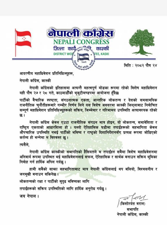 ‘नेपाली कांग्रेस केवल एउटा राजनीतिक संगठन मात्र होइन, यो लोकतन्त्र, समावेशीता र राष्ट्रिय एकताको आधारशीला हो । यस्तो ऐतिहासिक घडीमा तपाईँहरुको सहभागिता केवल औपचारिक उपस्थिति नभई पार्टीको भविष्य र राष्ट्रको दिशानिर्देशसँग प्रत्यक्ष रुपमा जोडिएको कर्तव्य हो भन्नेमा म विश्वस्त छु,’ जारी विज्ञप्तिमा भनिएको छ, ‘नेपाली कांग्रेस कास्कीको सभापतिको हैसियतले म तपाईँहरु सबैमा विशेष महाधिवेशनमा अनिवार्य रुपमा उपस्थित भई महाधिवेशनलाई सफल, ऐतिहासिक र सार्थक बनाउन सक्रिय भूमिका निर्वाह गर्न हार्दिक अपिल गर्दछु ।’