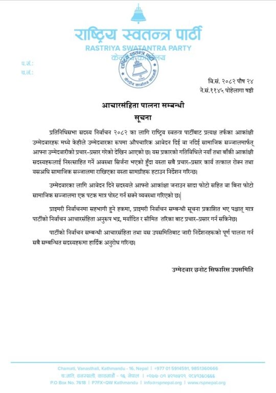 ‘प्रतिनिधि सभा सदस्य निर्वाचन २०८२ का लागि राष्ट्रिय स्वतन्त्र पार्टीबाट प्रत्यक्ष तर्फका आकांक्षी उम्मेदवारहरुमध्ये केहीले उम्मेदवारका रुपमा औपचारिक आवेदन दिई वा नदिई सामाजिक सञ्जालमार्फत् आफ्ना उम्मेदवारी प्रचारप्रसार गरेको देखिन आएको छ । यस प्रकारको गतिविधिले नयाँ तथा बाँकी आकांक्षी सदस्यहरुलाई निरुत्साहित गर्ने अवस्था सिर्जना भएको हुँदा यस्ता सबै प्रचारप्रसार कार्य तत्काल रोक्न तथा यसअघि सामाजिक सञ्जालमा राखिएका यस्ता सामग्रीहरु हटाउन निर्देशन गरिन्छ,’ जारी विज्ञप्तिमा भनिएको छ ।