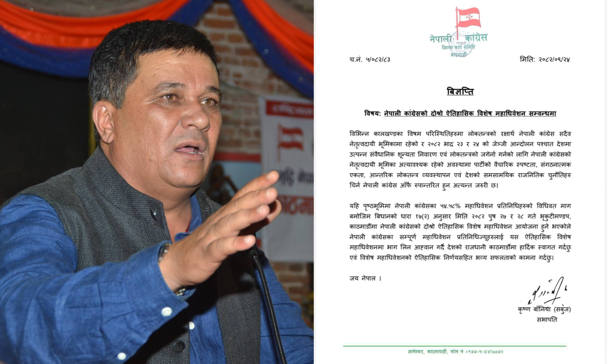 ‘नेपाली कांग्रेसमा ५४.५८ प्रतिशत महाधिवेशन प्रतिनिधिहरुको विधिवत माग बमोजिम विधानको धारा १७(२) अनुसार मिति २०८२ पुस २७ मर २८ गते भृकुटीमण्डप, काठमाडौंमा नेपाली कांग्रेसको दोस्रो ऐतिहासिक विशेष महाधिवेशन आयोजना हुने भएकोले नेपाली कांग्रेसका सम्पूर्ण महाधिवेशन प्रतिनिधिज्यूहरुलाई यस ऐतिहासिक विशेष महाधिवेशनमा भाग लिन आह्वान गर्दै देशको राजधानी काठमाडौंमा हार्दिक स्वागत गर्दछु, एवं विशेष महाधिवेशनको ऐतिहासिक निर्णयसहित भव्य सफलताको कामना गर्दछु,’ बानियाँद्वारा जारी विज्ञप्तिमा भनिएको छ ।