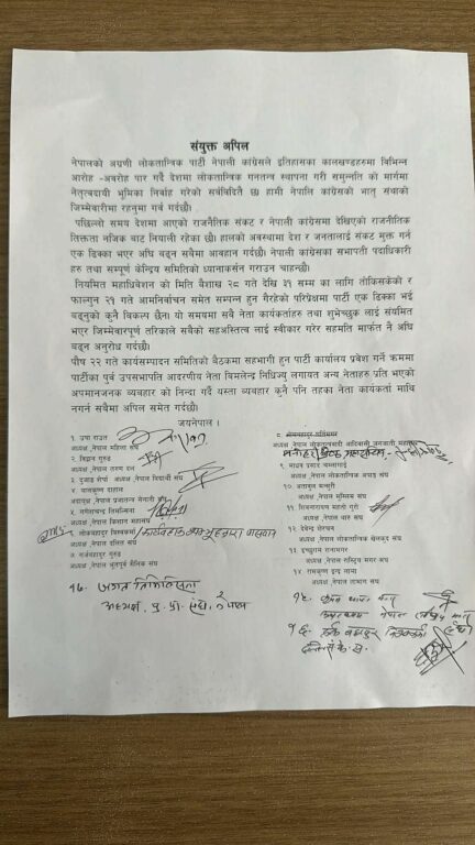 ‘पछिल्लो समय देशमा आएको राजनैतिक संकट र नेपाली कांग्रेसमा देखिएको राजनीतिक तिक्तता नजिकबाट नियालीरहेका छौँ । हालको अवस्थामा देश र जनतालाई संकटमुक्त गर्न एकढिक्का भएर अघि बढ्न सबैमा आह्वान गर्दछौँ । नेपाली कांग्रेसका सभापति पदाधिकारीहरु तथा सम्पूर्ण केन्द्रीय समितिको ध्यानाकर्षण गराउन चाहन्छौँ,’ जारी विज्ञप्तिमा भनिएको छ ।
