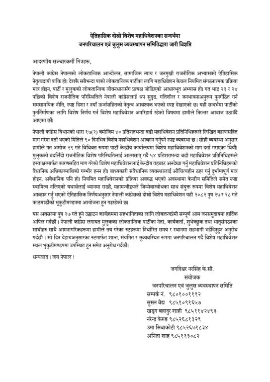 जनपरिचालन तथा जुलुस व्यवस्थापन समितिका संयोजक जगदीश्वरनरसिंह केसीले शुक्रबार पत्रकार सम्मेलन गर्दै त्यसबारे जानकारी दिएका हुन् ।