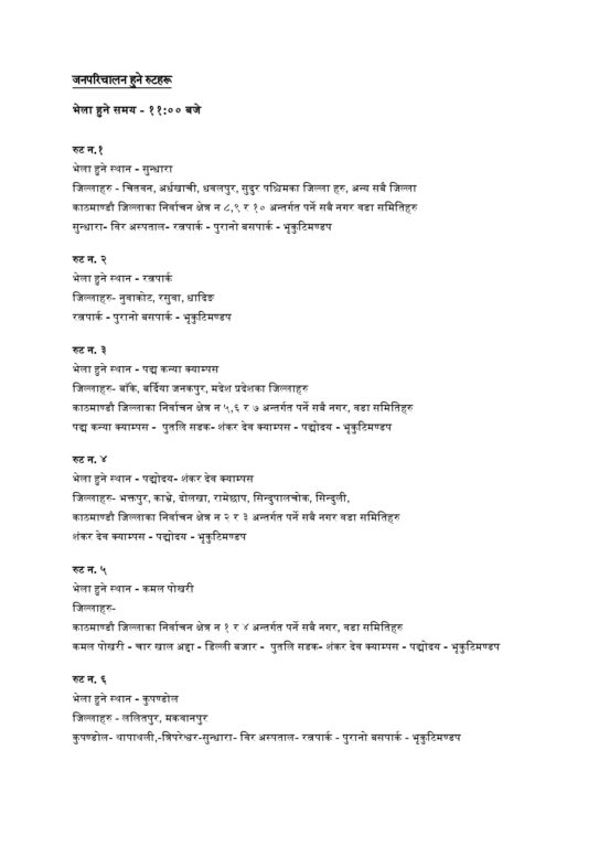 रुट नं १ अन्तर्गत सुन्धारामा जम्मा भएर चितवन, अर्घखाँची, नवलपुर, सुदूरपश्चिमका सबै जिल्ला तथा काठमाडौंको ८, ९, १० र अन्तर्गत पर्ने सबै वडा समितिबाट उपस्थितहरुको जुलुस अघि बढ्नेछ । ती ठाउँबाट जम्मा भएको जुलुस सुन्धारा–वीर अस्पताल–रत्नपार्क–पुरानो बसपार्क हुँदै भृकुटीमण्डप पुग्नेछ ।