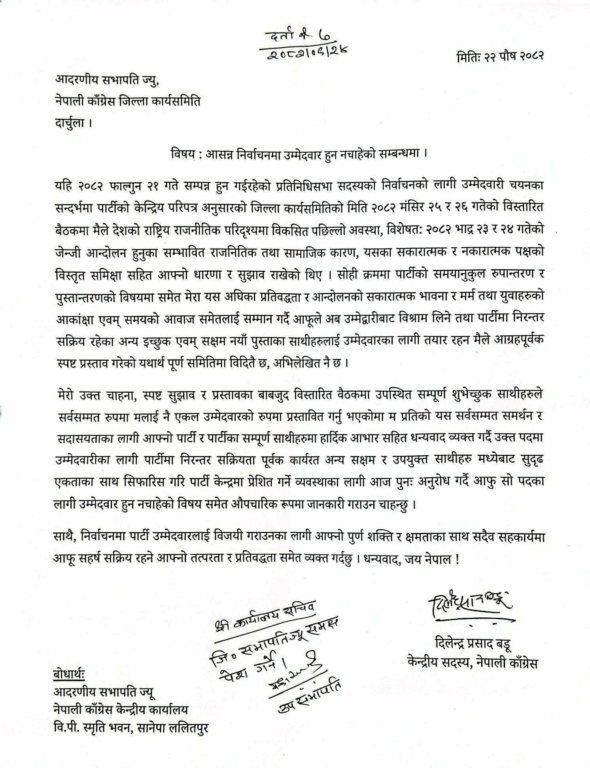 प्रतिनिधिसभा सदस्यका लागि दार्चुलाबाट एकल नाम सिफारिस भएका बडूले नेपाली कांग्रेस जिल्ला कार्यसमिति दार्चुलाका सभापतिलाई एक पत्र लेख्दै आफू उम्मेदवार नबन्ने घोषणा गरेका हुन् ।