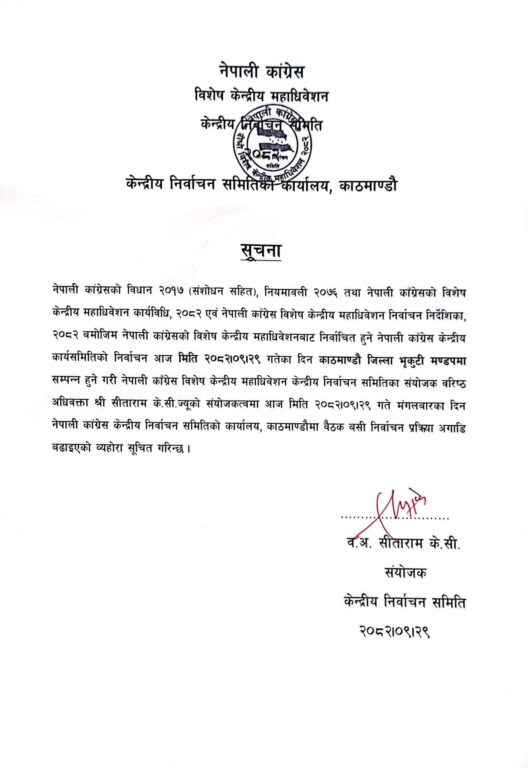 ‘काठमाडौं जिल्ला भृकुटीमण्डपमा सम्पन्न हुने गरी नेपाली कांग्रेस विशेष महाधिवेशन केन्द्रीय महाधिवेशन केन्द्रीय निर्वाचन समितिका संयोजक वरिष्ठ अधिवक्ता श्री सीताराम केसीज्यूको संयोजकत्वमा आज मिति २०८२–०९–२९ गते मंगलबारका दिन नेपाली कांग्रेस केन्द्रीय निर्वाचन समितिको कार्यालय, काठमाडौंमा बैठक बसी निर्वाचन प्रक्रिया अगाडि बढाइएको व्यहोरा सूचित गरिन्छ,’ केसीद्वारा जारी विज्ञप्तिमा भनिएको छ ।