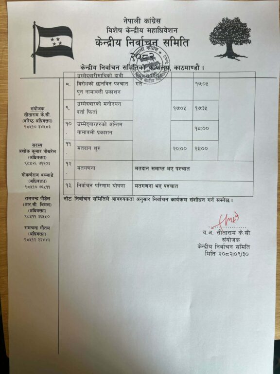 काठमाडौं । काठमाडौंको भृकुटीमण्डपमा जारी कांग्रेसको दोस्रो विशेष महाधिवेशनको निर्वाचन कार्यतालिका संशोधन गरिएको छ ।