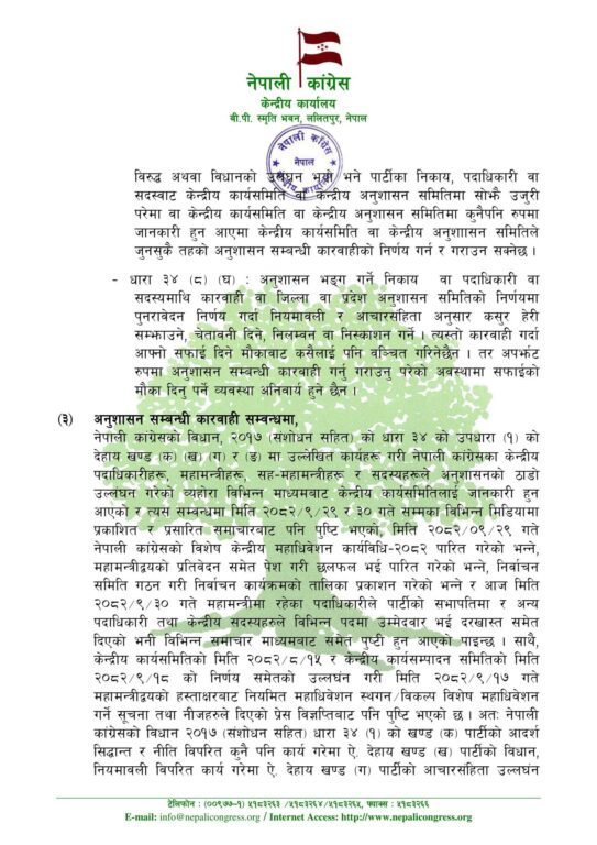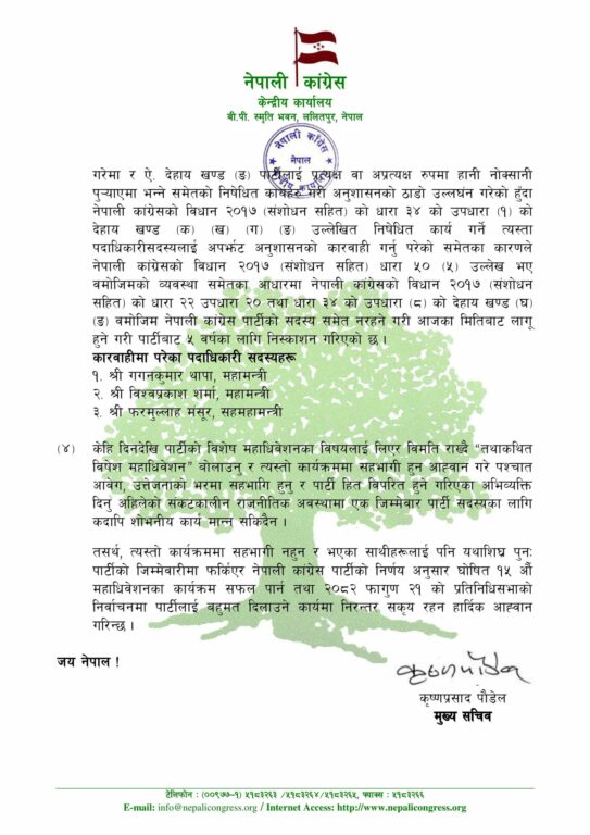 आइतबारबाट सुरु भएको कांग्रेसको विधान महाधिवेशनपछि राजनीति तरंगित बनेका बेला कांग्रेसले केन्द्रीय समिति बैठक बोलाएको थियो । आजको बैठकले तीन पदाधिकारीहरुलाई ५ वर्षसम्मका लागि पार्टी सदस्य समेत नरहने गरी कारबाही गर्ने निर्णय गरेको हो ।