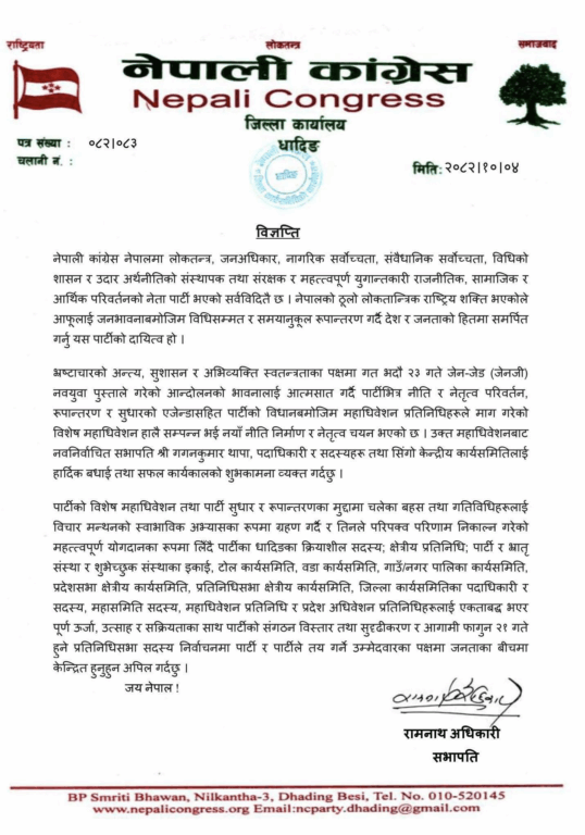 अधिकारीले जारी गरेको विज्ञप्तिमा नेपाली कांग्रेस नेपालको लोकतन्त्र, जनअधिकार, नागरिक स्वतन्त्रता, संवैधानिक सर्वोच्चता, विधिको शासन र उदार अर्थनीतिको संस्थापक तथा संरक्षक पार्टी भएको उल्लेख गरिएको छ ।