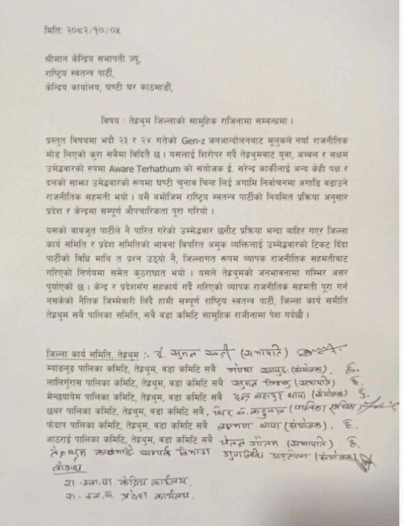 ‘पार्टीले नै पारित गरेको उम्मेदवार छनोट प्रक्रिया भन्दा बहिर गएर जिल्ला कार्यसमिति र प्रदेश कार्यसमितिको भावना विपरित अमुक व्यक्तिलाई उम्मेदवारको टिकट दिँदा पार्टीको विधिमाथि त प्रश्न उठ्यो नै जिल्लागत रुपमा व्यापक राजनीतिक सहमतिबाट गरिएको निर्णयमा समेत कुठाराघात भयो । यसले तेह्रथुमको जनभावनामा गम्भीर असर पुर्याएको छ,’ राजीनामा पत्रमा भनिएको छ, ‘केन्द्र र प्रदेशसँग सहकार्य गदैै गरिएको व्यापक राजनीतिक सहमति पूरा गर्न नसकेको नैतिक जिम्मेवारी लिँदै हामी सम्पूर्ण राष्ट्रिय स्वतन्त्र पाटी, जिल्ला कार्यसमिति तेह्रथुमका सबै पालिका समिति, सबै वडा कमिटी सामूहिक राजीनामा पेश गर्दैछौँ ।’
