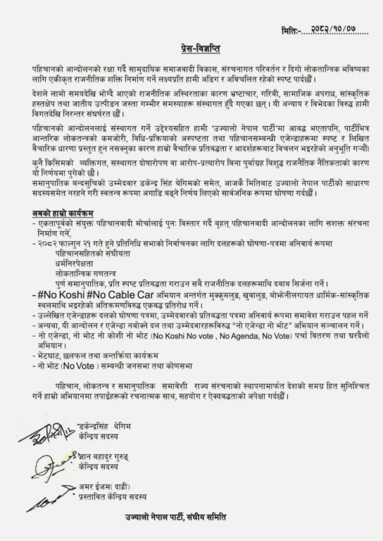 ‘उज्यालो नेपाल पार्टी भित्र आन्तरिक लोकतन्त्र अत्यन्त कमजोर छ, विचार, विधि र प्रक्रिया अस्पष्ट छन्, र पहिचानसम्बन्धी एजेन्डा लिखित रूपमा छैन ।,‘ नेताहरूले निकालेको विज्ञप्तिमा उल्लेख छ