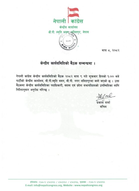‘नेपाली कांग्रेस केन्द्रीय कार्यसमितिको बैठक २०८२ माघ ९ गते शुक्रबार दिउँसो १ः०० बजे पार्टीको केन्द्रीय कार्यालय, वीपी स्मृती नगर ललितपुरमा बस्ने भएको छ । उक्त बैठकमा केन्द्रीय कार्यसमितिका पदाधिकारी, सदस्य एवं प्रदेश सभापतिहरुको उपस्थितिका लागि निर्देशानुसार अनुरोध गरिन्छ,’ जारी विज्ञप्तिमा भनिएको छ ।