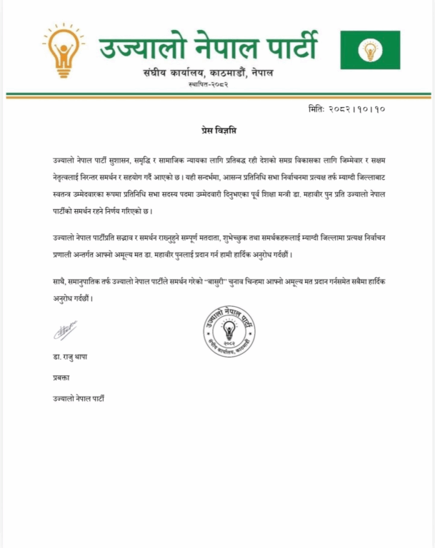 काठमाडौं । म्याग्दीबाट स्वतन्त्र उम्मेदवार बनेका निवर्तमान शिक्षामन्त्री महावीर पुनलाई उज्यालो नेपाल पार्टीले समर्थन गर्ने भएको छ ।