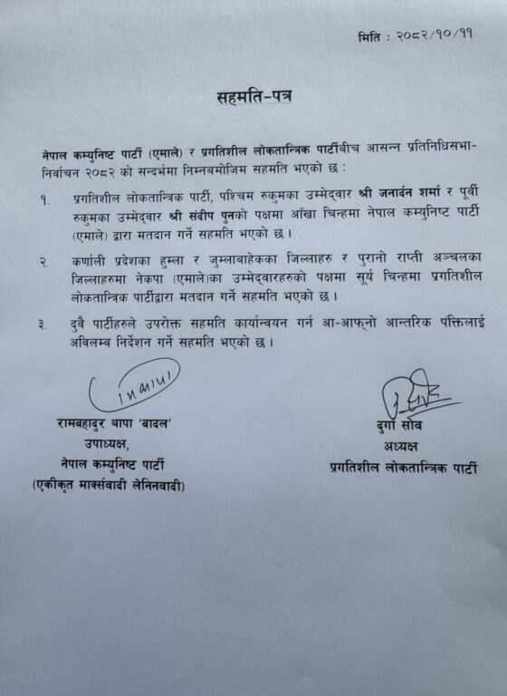 एमाले उपाध्यक्ष रामबहादुर थापा ‘बादल’ र प्रगतिशील लोकतान्त्रिक पार्टीबाट अध्यक्ष दुर्गा सोवले उक्त सहमतिपत्रमा हस्ताक्षर गरेका हुन् ।