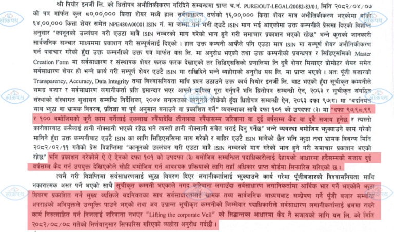 धितोपत्र अभौतिकीकरण गर्ने सम्बन्धमा भ्रामक सूचना सार्वजनिक गरेका कारण ६४ लाख कित्ता संस्थापक लगानीकर्ता रहेको कम्पनीले गलत र भ्रामक सूचना प्रकाशन गरी धितोपत्र बजारलाई प्रभावित बनाउन खोजेको भन्दै २ वर्ष कैद सजायसमेतकै माग गरिएको हो ।