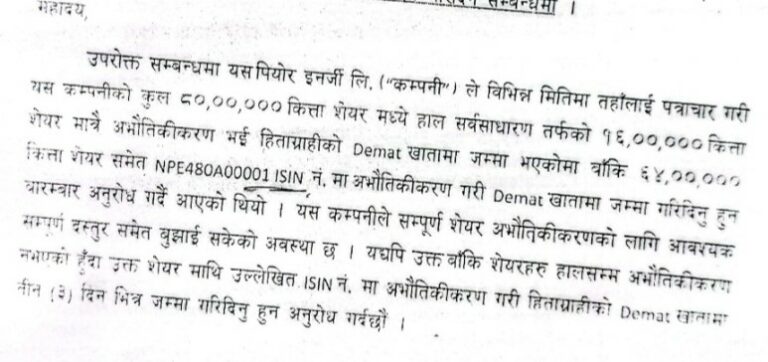 पियोर इनर्र्जीले खण्डन निकालेपछि सीडीएससीमा दिएको निवेदनमा समेत सर्वसाधारण समूहकै आईजीनमा तीन दिनभित्र अभौतिकीकरण गरिदिन भनिएको छ ।