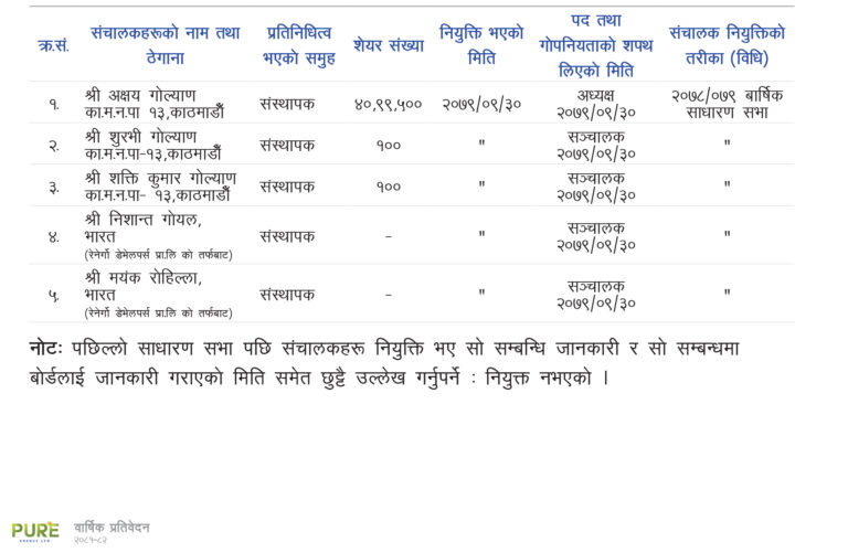 पियोर इनर्र्जीले सार्वजनिक गरेको वार्षिक विवरणमा शक्तिकुमार गोल्याणको नाममा १ सय कित्ता र शुरभी गोल्याणको नाममा पनि १ सय कित्ता सेयर रहेको देखिन्छ । त्यसैगरी निशान्त गोयल र मयंक रोहिल्ला पनि पियोर इनर्र्जीमा लगानी गर्ने कम्पनीको प्रतिनिधिका रूपमा रहेकामा यी पाँच जना संस्थापक सञ्चालक रहेका छन् ।