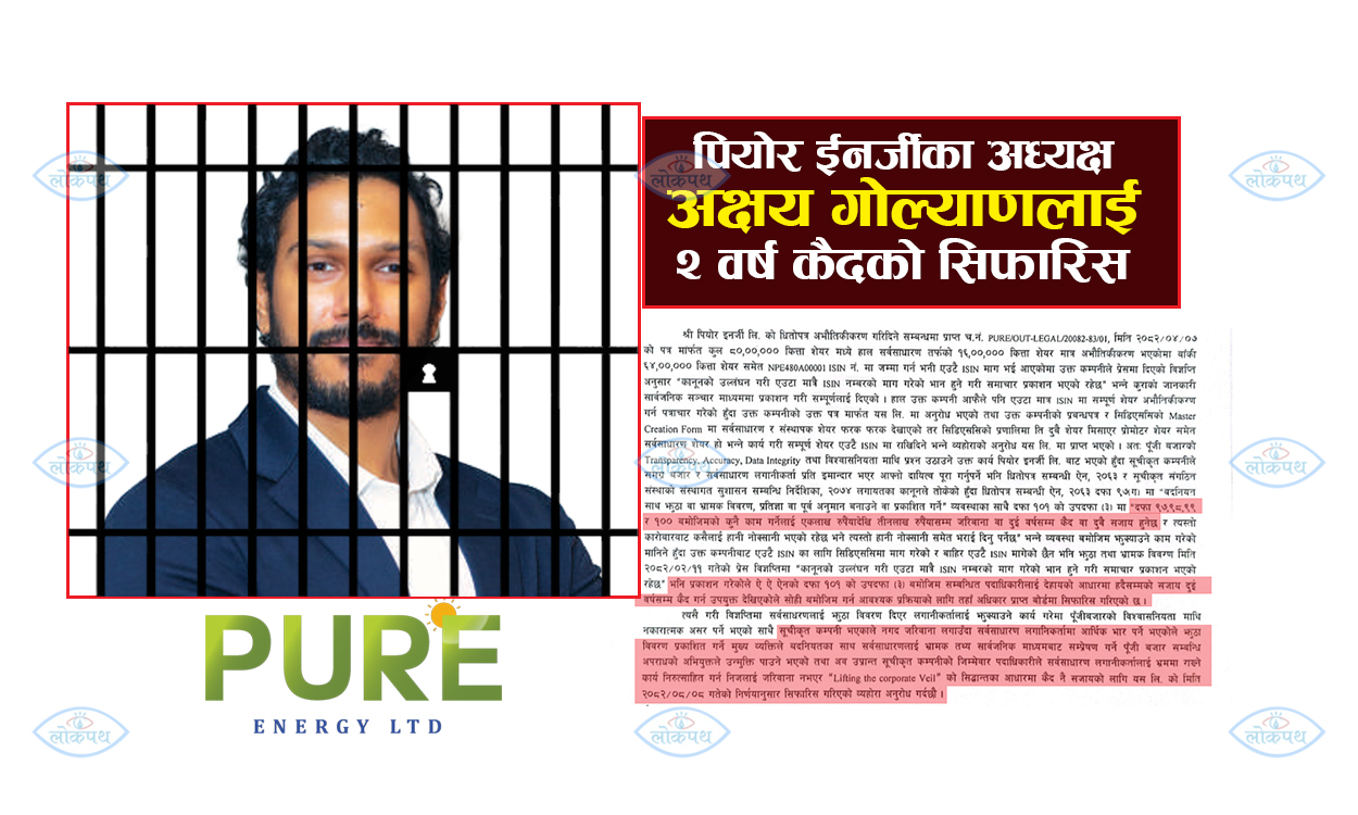 काठमाडौं । पियोर इनर्र्जी लिमिटेडका संस्थापक लगानीकर्ताका रूपमा रहेका गोल्यान समूहका पदाधिकारीलाई २ वर्ष कैदका लागि सिफारिस गरिएको छ । सीडीएस एन्ड क्लियरिङ हाउसले पियोर इनर्जीका पदाधिकारीलाई २ वर्षको कैद सजाय वा ३ लाख रुपैयाँसम्म जरिवाना वा दुवै सजायका लागि सिफारिस गरेको हो ।