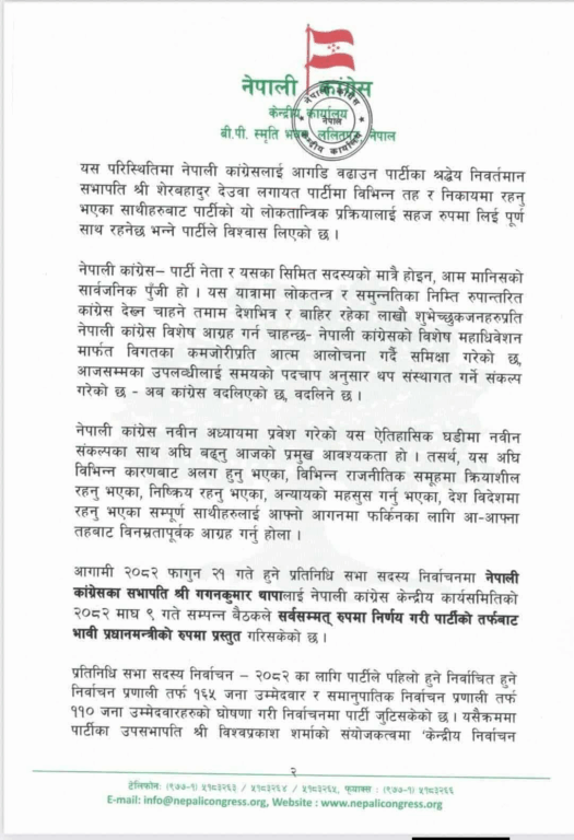परिपत्रमा पार्टीका निवर्तमान सभापति शेरबहादुर देउवाको नाम नै उल्लेख गर्दै सहयोगको अपेक्षा पनि गरिएको छ । देउवालगायत पार्टीका विभिन्न तह र निकायमा रहेका नेताहरूबाट यो लोकतान्त्रिक प्रक्रियामा पूर्ण साथ र सहयोग रहने विश्वास पार्टीले लिएको उल्लेख गरिएको छ ।