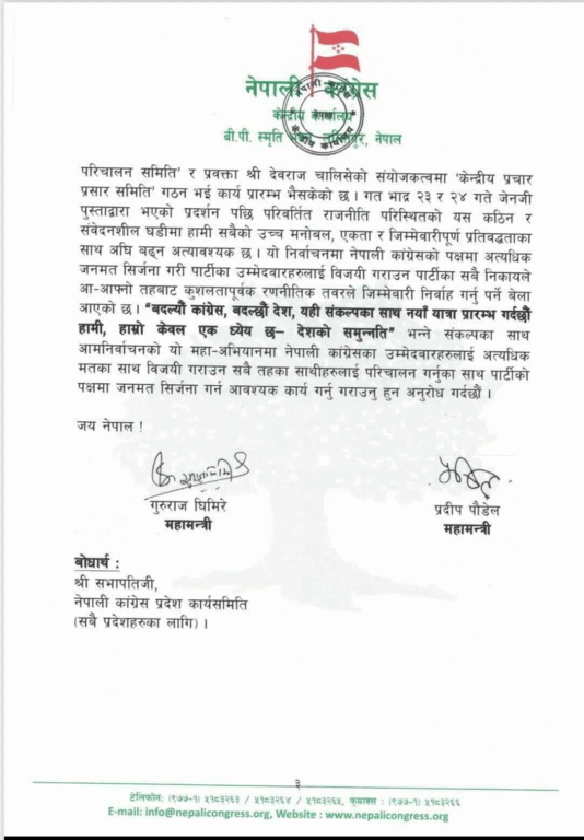 परिपत्रमा कांग्रेस नयाँ ऊर्जा र एकतासहित रुपान्तरणको दिशामा अघि बढिरहेको उल्लेख गर्दै उच्च आत्मविश्वास र व्यापक तयारीका साथ निर्वाचनमा होमिनुपर्ने समय आएको जनाइएको छ ।