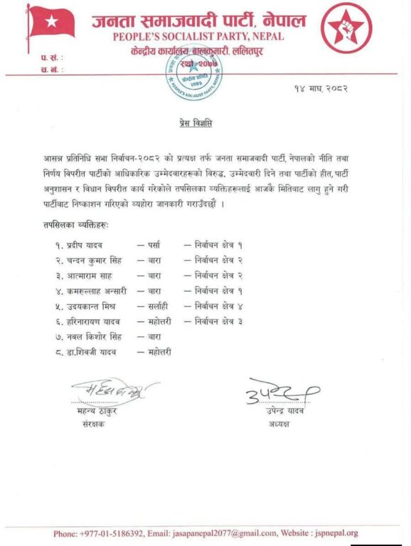 काठमाडौं । उपेन्द्र यादव नेतृत्वको जनता समाजवादी (जसपा) नेपालले पूर्वमन्त्री प्रदीप यादवसहित ८ जनालाई पार्टीबाट निष्काशन गरेको छ ।