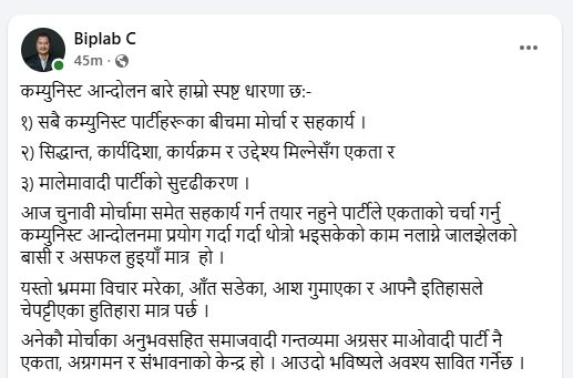 बुधबार नेकपा संयोजक पुष्पकमल दाहाल ‘प्रचण्ड’ले एकतामा आउन आग्रह गरेपछि त्यसको प्रतिक्रिया जनाउँदै विप्लवले चुनावी सहकार्य बिना एकताको चर्चा गर्नु व्यवहारिक नभएको बताएका हुन् ।