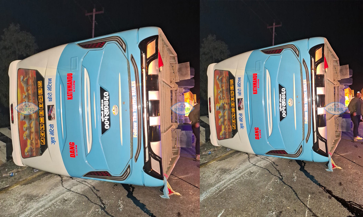 आज बिहान करिब ३ बजेको समयमा दाङबाट काठमाडौंतर्फ जाँदै गरेको लुम्बिनी प्रदेश ०२–००१ ख ०४६० नम्बरको बस आफैँ अनियन्त्रित भई सडकमा पल्टिँदा दुर्घटना भएको हो ।