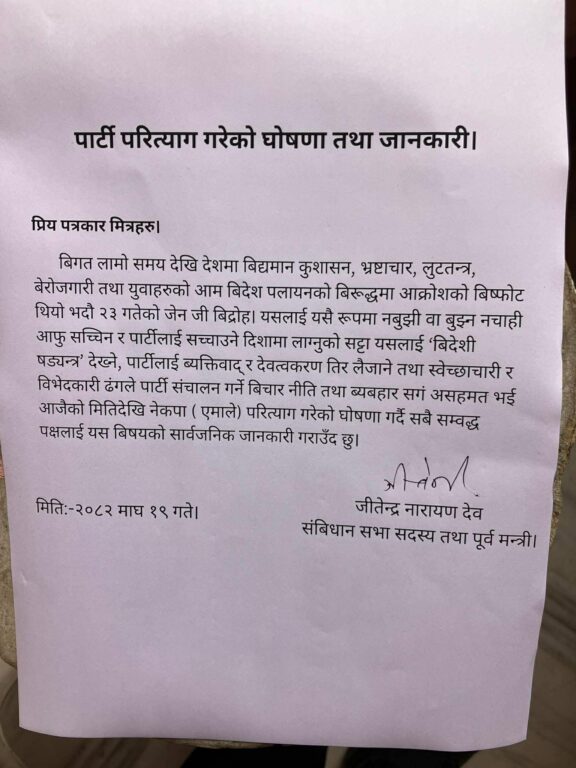 काठमाडौं । संविधानसभा सदस्य एवं पूर्वमन्त्री जितेन्द्र देवले नेकपा एमाले परित्याग गरेका छन् ।