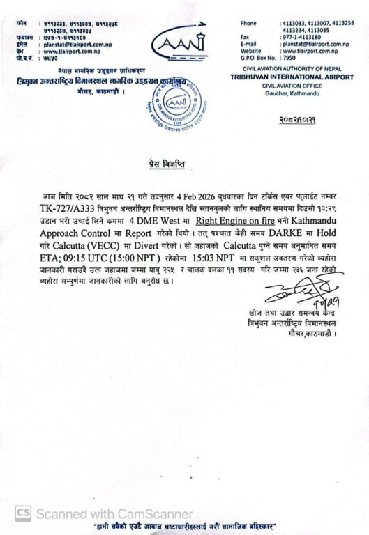 काठमाडौं । त्रिभुवन अन्तर्राष्ट्रिय विमानस्थलबाट उडेको टर्कीस एयरको जहाजको इन्जिनमा आगो लागेपछि कोलकता डाइभर्ट गरिएको छ ।