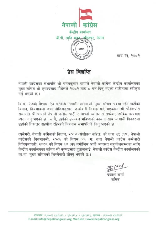 ‘नेपाली कांग्रेसको विधान, २०१७ (संशोधनसहित) को धारा २५(१०), नेपाली कांग्रेसको नियमावली, २०७६ को नियम ४६ (ग) तथा नेपाली कांग्रेस कर्मचारी विनियमावली, २०७९ को नियम १४ (क) बमोजिम अर्को व्यवस्था नहुन्जेलसम्मका लागि केन्द्रीय कार्यालयका सचिव श्री कृष्णप्रसाद दुलाललाई नेपाली कांग्रेस केन्द्रीय कार्यालयको कावा मुख्यसचिवको जिम्मेवारी तोक्नुभएको छ,’ कार्यालय सचिव प्रकाश शर्माद्वारा जारी विज्ञप्तिमा भनिएको छ ।