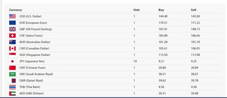 केन्द्रीय बैंकका अनुसार आज अमेरिकी डलर एकको खरिददर १४४ रूपैयाँ ४० पैसा र बिक्रीदर १४५ रूपैयाँ कायम भएको छ । युरोपियन युरो एकको खरिददर १७० रुपैयाँ ५१ पैसा र बिक्रीदर १७१ रुपैयाँ २२ पैसा रहने छ ।