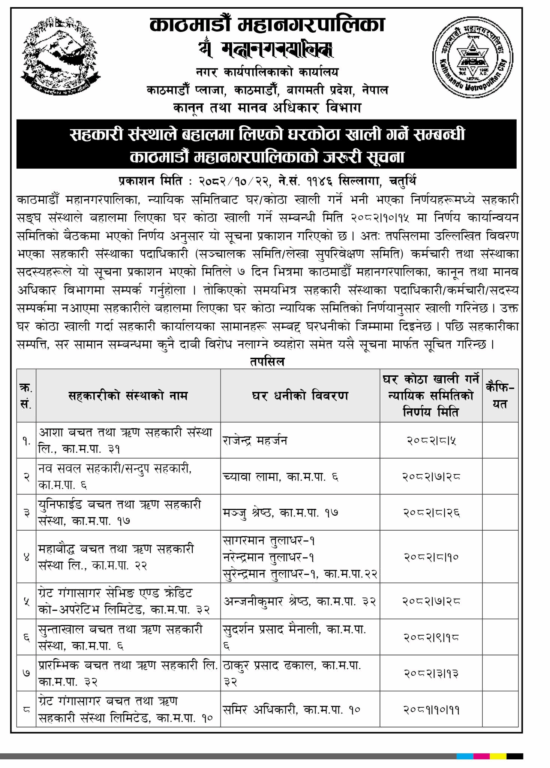 काठमाडौं । काठमाडौं महानगरपालिकाले विभिन्न सहकारी संस्थाहरूलाई बहालमा लिएको घर तथा कोठा खाली गर्न ७ दिने अल्टिमेटम दिएको छ ।