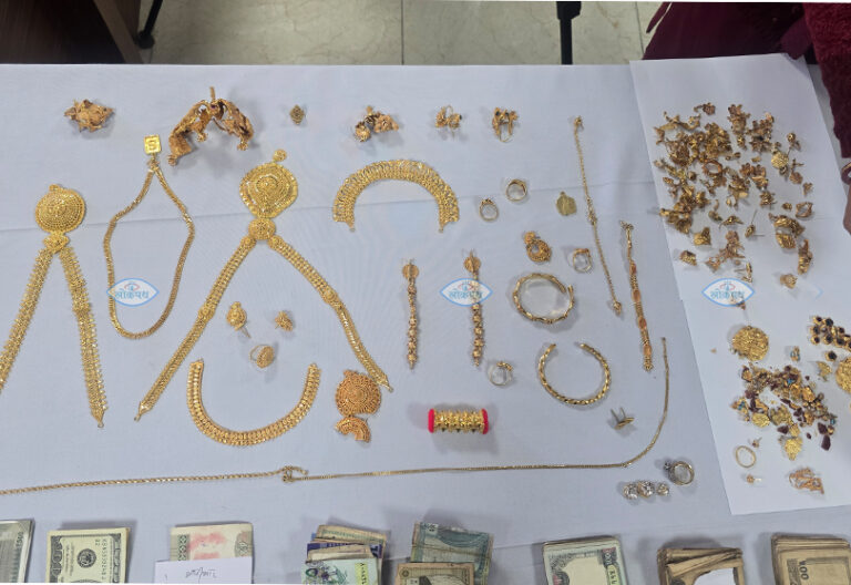 त्यसपछि प्राथमिक उपचार गराएर उनी बस्ने गरेको डेरामा लगेर खानतलासी गर्दा थारुको डेराबाट आवरण बिगारिसकेको र नबिगारेको समेत गरी ६६ तोला सुनका गरगहना, १ किलोभन्दा बढी चाँदीका सिक्का र गरगहना, १ लाख ६३ हजार ६०० नेपाली रुपैयाँ लगायत बरामद भएको छ ।