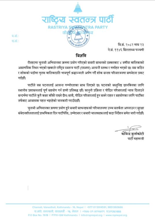 काठमाडौं । राष्ट्रिय स्वतन्त्र पार्टी (रास्वपा) ले रौतहटमा चुनावी अभियानका क्रममा गाडीको ठक्करबाट बालिकाको मृत्यु भएको घटनाप्रति दुःख व्यक्त गरेको छ ।