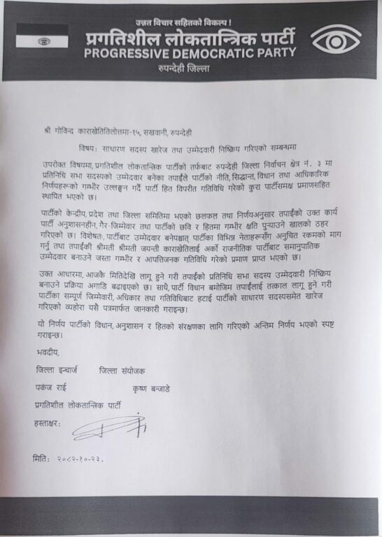 रुपन्देही–३ का उम्मेदवारलाई नै प्रलोपाले पार्टीबाट निकाल्यो