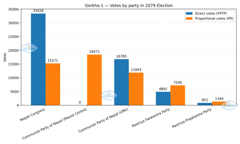 यता गोरखा १ मा एमाले, राप्रपा र उज्यालो नेपाल पार्टी भने तुलनात्मक रूपमा निकै कमजोर पार्टी रहेको देखिन्छ ।