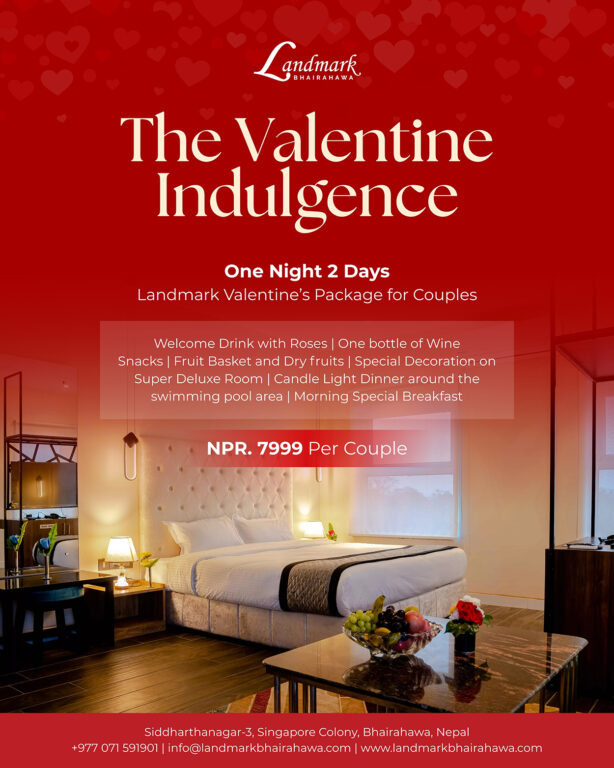 भैरहवामा रहेको ल्याण्डमार्क होटेलले पनि ‘द भ्यालेन्टाइन इन्डलजेन्स’ थिममा भ्यालेन्टाइन प्याकेज सार्वजनिक गरेको छ । भैरहवाको गौतमबुद्ध अन्तर्राष्ट्रिय विमानस्थल नजिकै रहेको ल्याण्डमार्कले ८ हजार रुपैयाँमै आकर्षक अफर ल्याएको हो ।