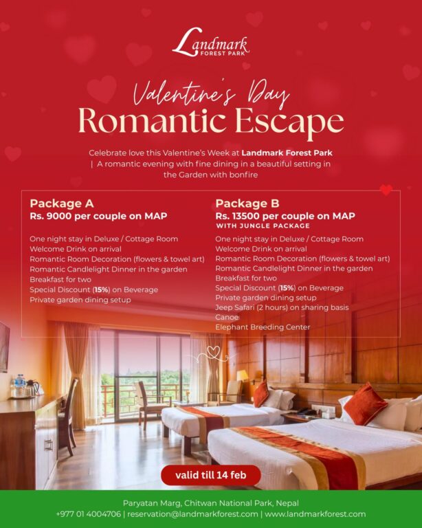 ल्याण्डमार्क फरेस्ट पार्कमै १३ हजार ५ सय रुपैयाँमा अर्को प्याकेज समेत दिइएको छ । उक्त प्याकेजमा पनि रोमान्टिक डेकोरेसनसहितको डिलक्स रुम, वेलकम ड्रिंक्स, क्याण्डललाइट डिनर र ल्याभिस ब्रेकफास्टको अलावा क्यानोइङ, २ घण्टाको जंगल जिप सफारी र हात्ती प्रजनन केन्द्रको अवलोकन गराइने छ । यो अफर फेब्रुअरी १४ अर्थात् भ्यालेन्टाइन डे सम्मका लागि उपलब्ध हुने ल्याण्डमार्कले जनाएको छ ।