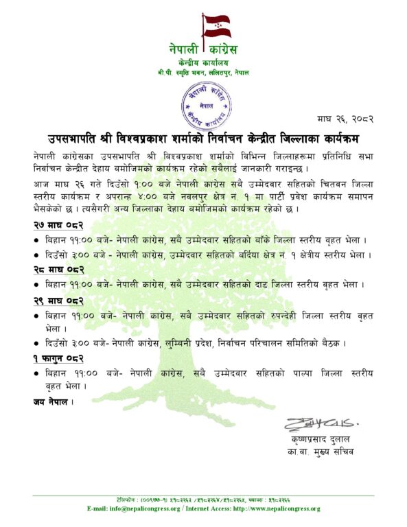 काठमाडौं । नेपाली कांग्रेसका उपसभापति विश्वप्रकाश शर्माले फागुन १ गतेसम्म विभिन्न जिल्लामा चुनावी कार्यक्रममा सहभागी हुने कार्यतालिका सार्वजनिक भएको छ ।