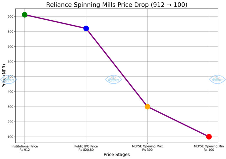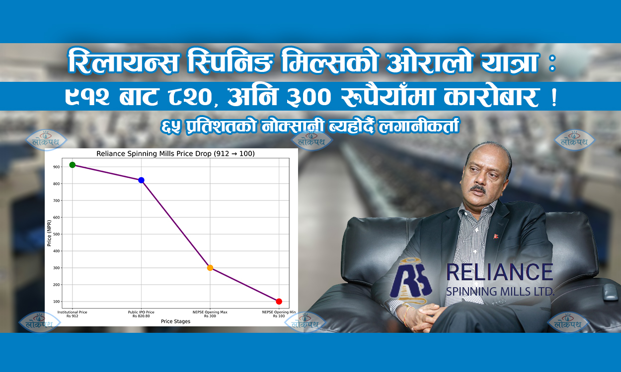 लोकपथ डटकमले रिलायन्स स्पिनिङ मिल्स प्रकरणमा यसअघि नै ‘रिलायन्स स्पिनिङ मिल्स आइपिओ प्रकरण : छानबिनको नाममा ‘चोरलाई नै सम्पत्तिको साँचो’ !’ शीर्षकमा विशेष रिपोर्ट समेत प्रकाशन गरिसकेको छ । रिलायन्सको वित्तीय विवरणमा छेडखानी गर्ने, करोडौँ बक्यौता लुकाउने र संस्थागत लगानीकर्तासँगको मिलेमतोमा मूल्य आकासिएको आरोप झेलिरहेको कम्पनीको सेयर अन्ततः सूचीकृत हुँदा वास्तविक हैसियतमै झरेको छ । नेप्सेले ओपनिङ रेन्ज दिँदा कम्पनीले विक्री गरेको मूल्यभन्दा समेत कममा निर्धारण गरिएको छ ।