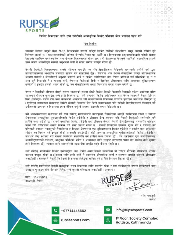 काठमाडौं । रूप्से स्पोर्टस् म्यानेज्मेन्टले क्रिकेटको विकासका लागि अत्याधुनिक क्रिकेट एकेडेमी र प्रशिक्षण केन्द्र बनाउने भएको छ ।