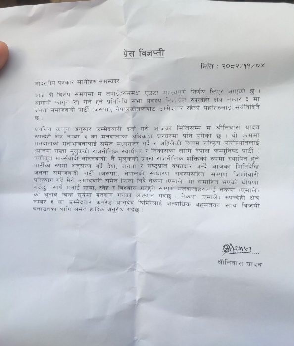 काठमाडौं । प्रतिनिधिसभा सदस्य निर्वाचनअन्तर्गत रुपन्देही क्षेत्र नम्बर ३ मा जनता समाजवादी पार्टी (जसपा), नेपालका उम्मेदवार नै एमाले प्रवेश गरेका छन् । जसपा नेपालका उम्मेदवार रहेका श्रीनिवास यादव उम्मेदवारी फिर्ता लिँदै एमाले प्रवेश गरेका हुन् ।
