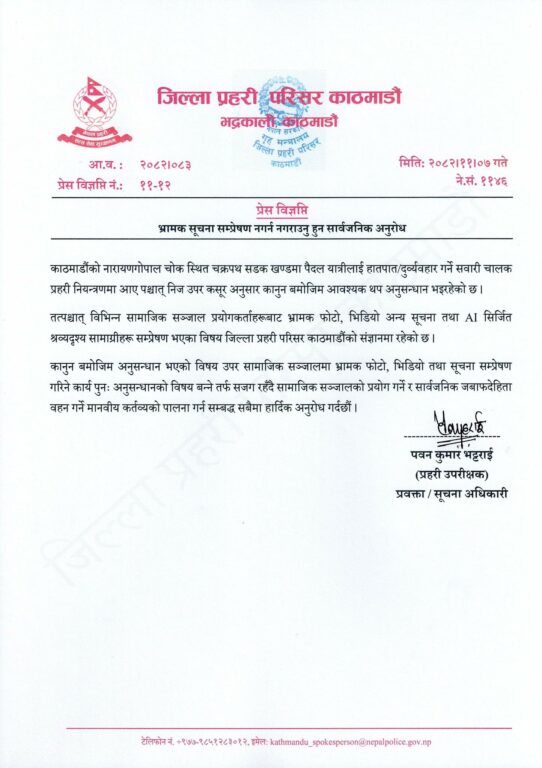 ‘विभिन्न सामाजिक सञ्जाल प्रयोगकर्ताहरुबाट भ्रामक फोटो, भिडियो अन्य सूचना तथा एआई सिर्जित श्रव्यदृश्य सामग्रीहरु सम्प्रेषण भएका विषय जिल्ला प्रहरी परिसर काठमाडौंको संज्ञानमा रहेको छ,’ जारी विज्ञप्तिमा भनिएको छ, ‘कानुन बमोजिम अनुसन्धान भएको विषय उपर सामाजिक सञ्जालमा भ्रामक फोटो, भिडियो तथा सूचना सम्प्रेषण गरिने कार्य पुनः अनुसन्धानको विषय बन्नेतर्फ सजग रहँदै सामाजिक सञ्जालको प्रयोग गर्ने र सामाजिक जवाफदेहिता वहन गर्ने माननीय कर्तव्यको पालना गर्न सम्बद्ध सबैमा हार्दिक अनुरोध गर्दछौँ ।’