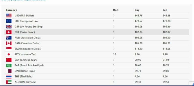 जापानी येन १० को खरिददर नौ रुपैयाँ ३६ पैसा र बिक्रीदर नौ रुपैयाँ ४० पैसा, चिनियाँ युआन एकको खरिददर २० रुपैयाँ ९६ पैसा र बिक्रीदर २१ रुपैयाँ ०४ पैसा, साउदी अरेबियन रियाल एकको खरिददर ३८ रुपैयाँ ६० पैसा र बिक्रीदर ३८ रुपैयाँ ७६ पैसा, कतारी रियाल एकको खरिददर ३९ रुपैयाँ ७२ पैसा र बिक्रीदर ३९ रुपैयाँ ८९ पैसा कायम भएको छ ।