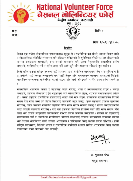 भोलेन्टियर्स फोर्सका प्रमुख कमान्डर पुष्पराज श्रेष्ठले शुक्रबार वक्तव्य जारी रास्वपाका शीर्ष नेताबाट एमाले नेतृत्वमाथि अनावश्यक लाञ्छना लगाइएको र पार्टीको झन्डासमेत जलाइएको भन्दै प्रशासनले कारबाही नगरे प्रतिवादमा उत्रिने चेतावनी दिएका छन् । श्रेष्ठले शुक्रबार वक्तव्य जारी गर्दै झन्डा जलाउने, उत्तेजना फैलाउने र द्वेष भड्काउने कार्यलाई अराजक मानसिकताको प्रतीक भनेका छन् ।