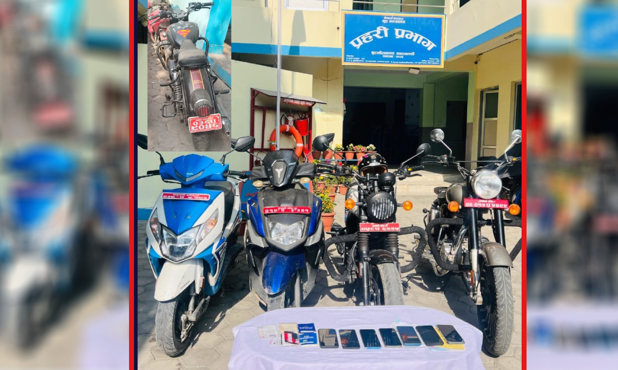 प्रहरीका अनुसार बूढानिलकण्ठबाट चोरी भएको बुलेट मोटरसाइकल, ठमेलबाट चोरि भएको स्कुटर, ललितपुरबाट चोरी भएको स्कुटर, कालिमाटीबाट चोरी भएको बुलेट मोटरसाइकल र बानेश्वरबाट चोरी भएको बुलेट मोटरसाइकल बरामद गरिएको छ ।
