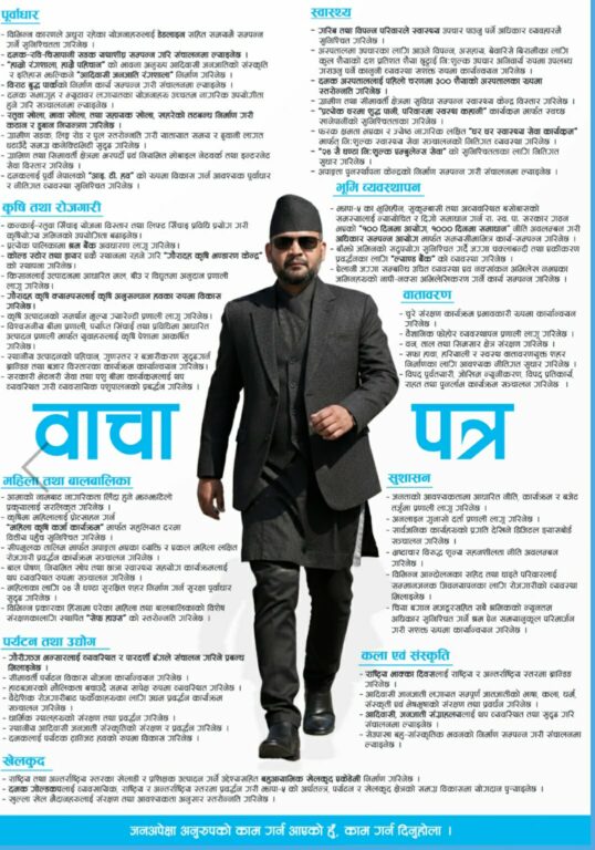 काठमाडौं । झापा–५ बाट प्रतिनिधिसभा सदस्यको उम्मेदवार बनेका राष्ट्रिय स्वतन्त्र पार्टी (रास्वपा) का वरिष्ठ नेता बालेन्द्र शाह (बालेन) ले सोमबार चुनावी घोषणापत्र ( बाचापत्र ) सार्वजनिक गरेका छन् । जसमा उनले मुख्य ९ वटा प्रतिबद्धता जनाएका छन् ।