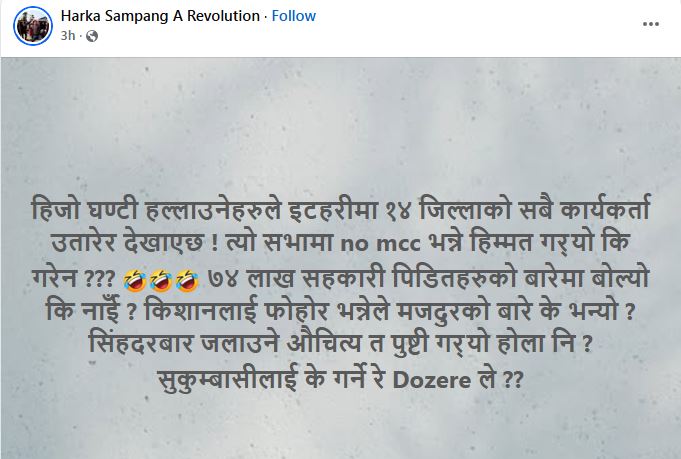 सामाजिक सञ्जालमार्फत धारणा सार्वजनिक गर्दै उनले सभामा सहकारी पीडित र एमसीसीजस्ता महत्त्वपूर्ण विषयमा के धारणा राखियो भन्ने जिज्ञासा व्यक्त गरेका हुन् ।