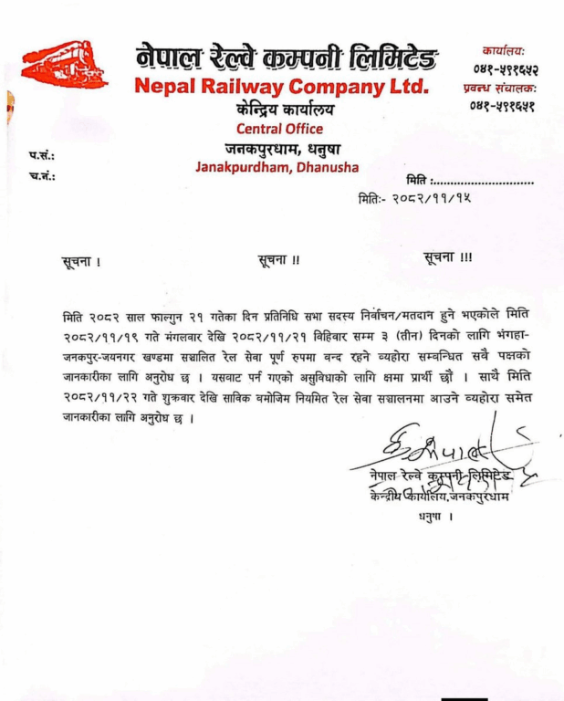 सूचनाअनुसार यही २१ फागुनमा हुने प्रतिनिधिसभा सदस्य निर्वाचनमा शान्तिसुरक्षा प्रत्याभूति गराउने उद्देश्यले १९ फागुनदेखि २१ गते बिहीबारसम्म भंगाहा-जनकपुर-जयनगर खण्डमा सञ्चालित रेल सेवा बन्द रहने जनाइएको हो ।